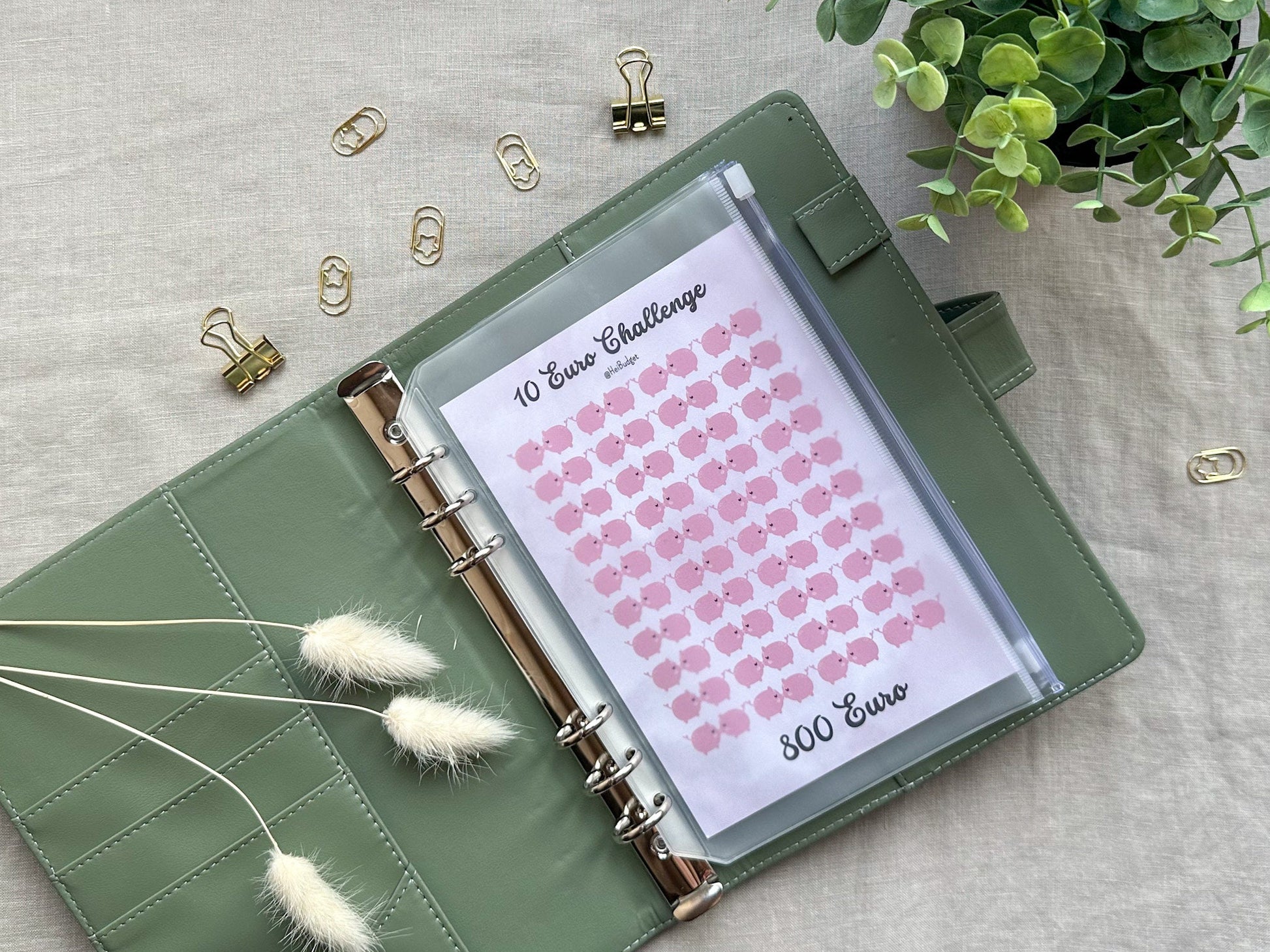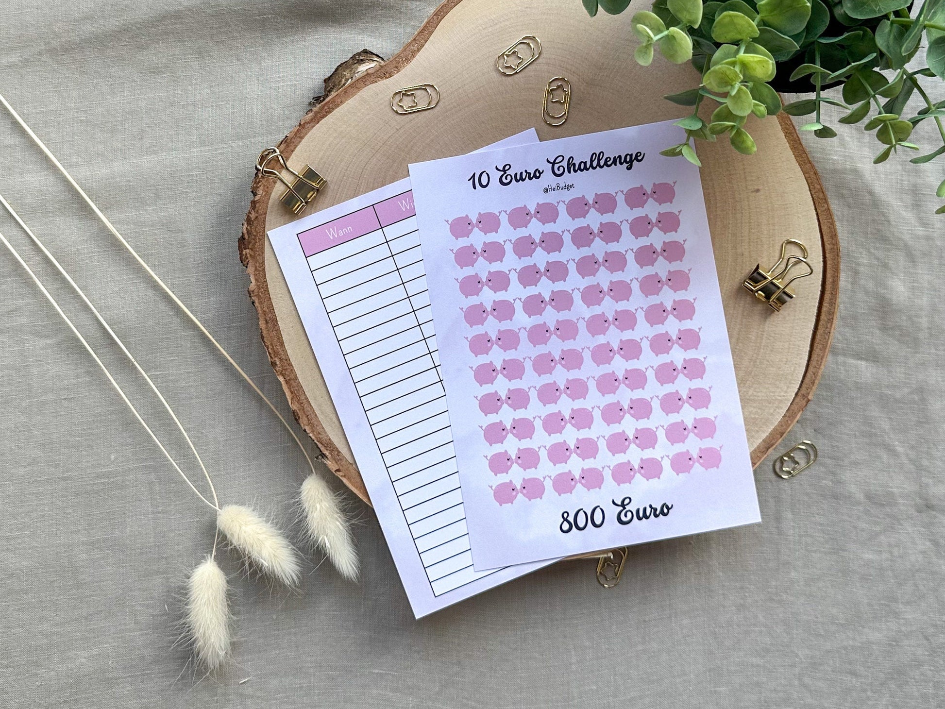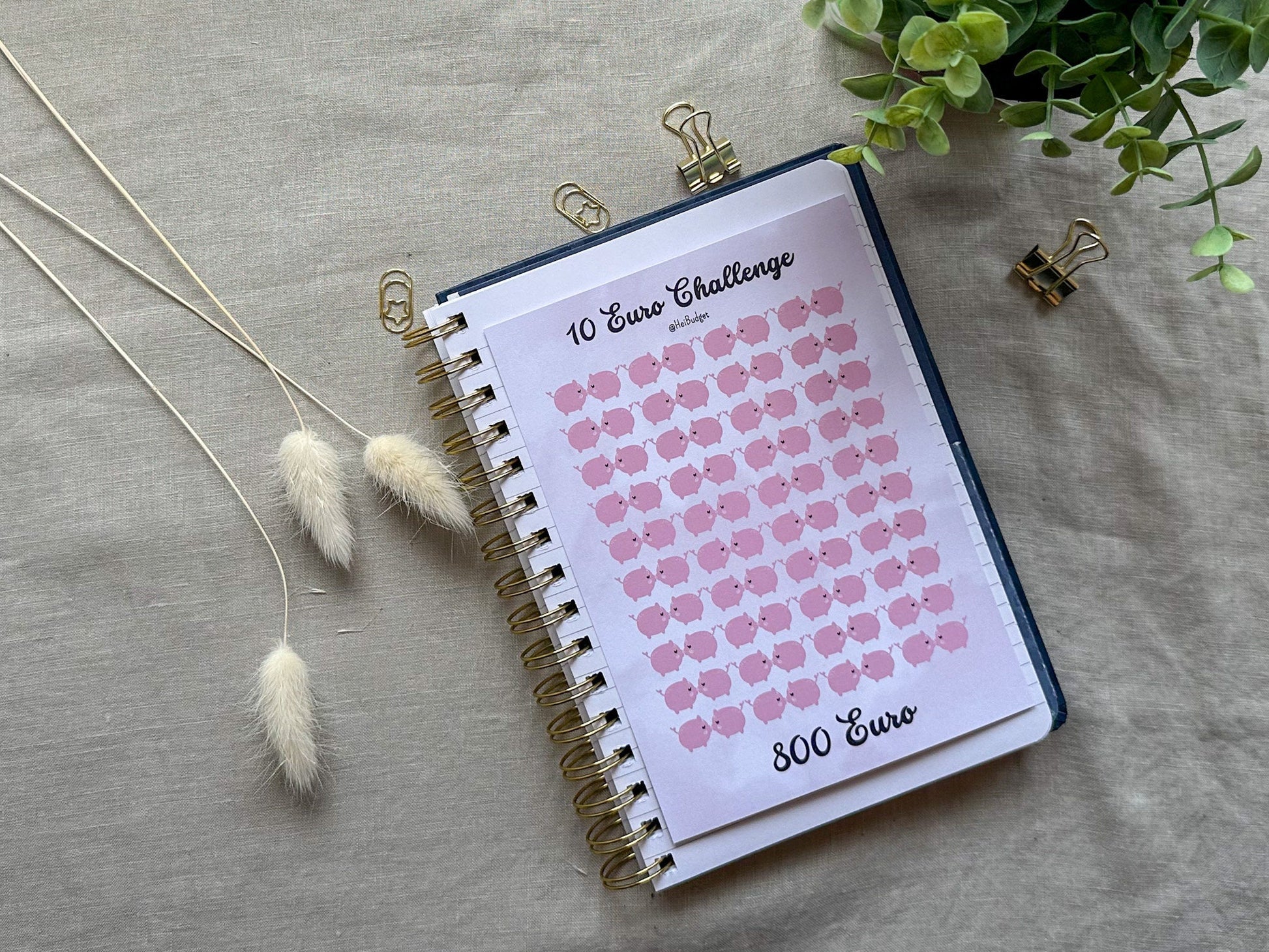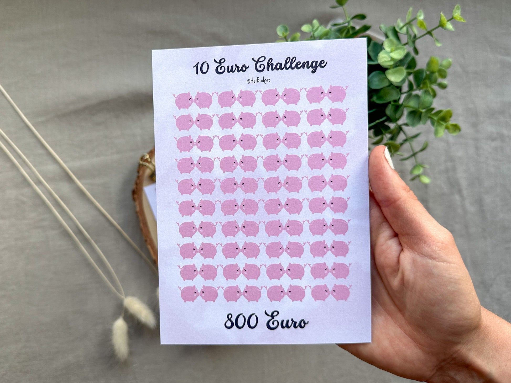 Die 10 Euro Challenge ist ein Klassiker unter den Sparchallenges! Hier bekommst du sie in einem süßen Schweinchen Look. Da macht das Sparen grunzig viel Spaß. Hast du am Ende alle Schweinchen abgestrichen, hast du 800 Euro gespart. Juhu!