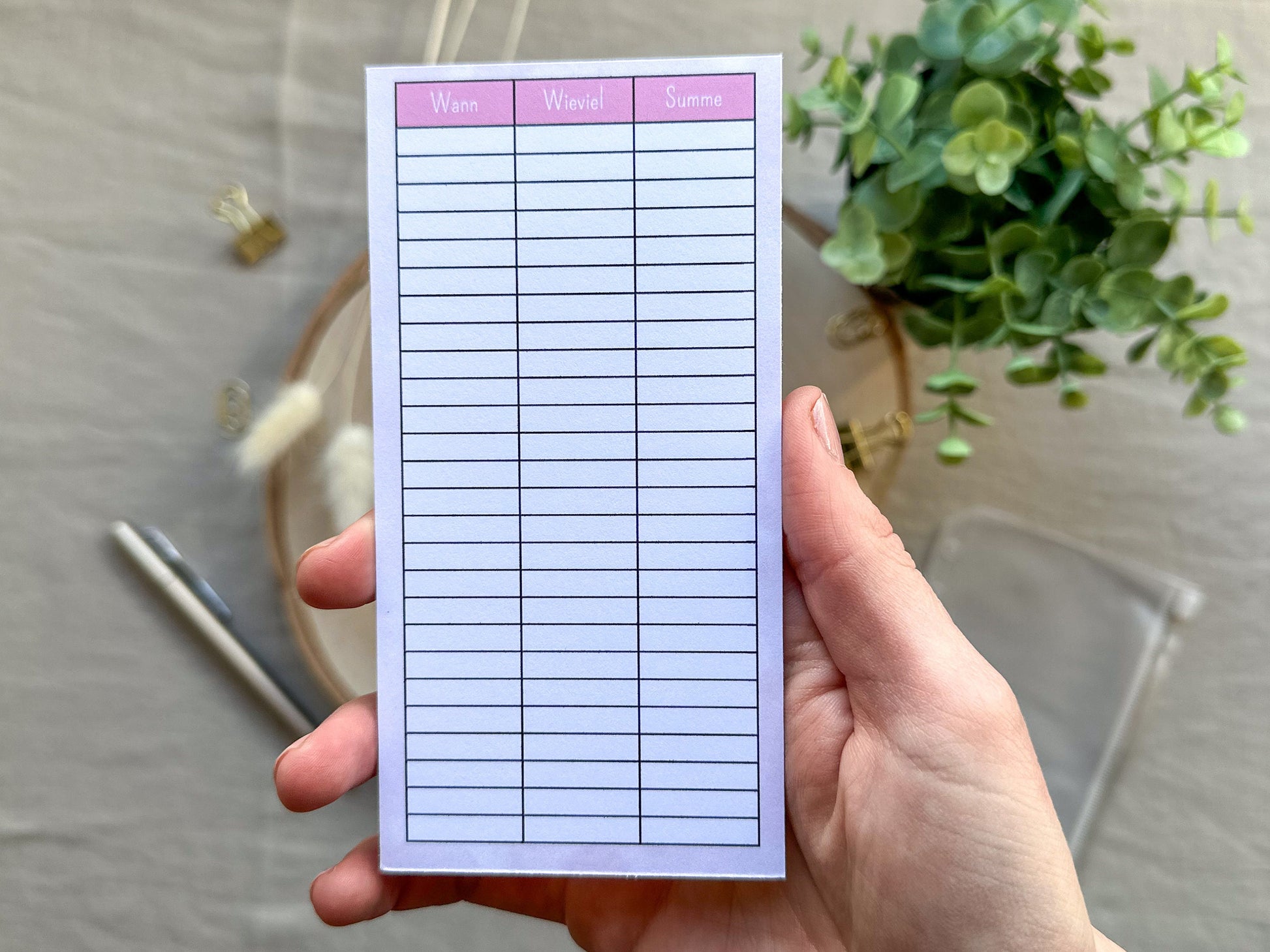 Du hast auf der Rückseite der Sparchallenge gleich die Möglichkeit die gesparten Beträge einzutragen, und siehst so auf einem Blick, was du schon gespart hast.