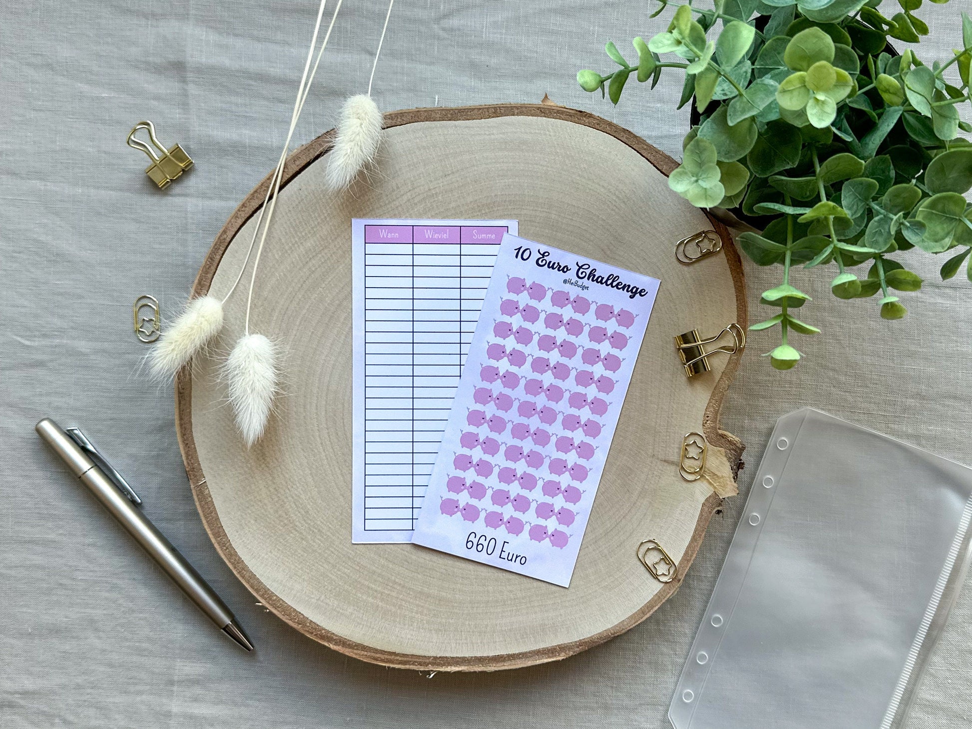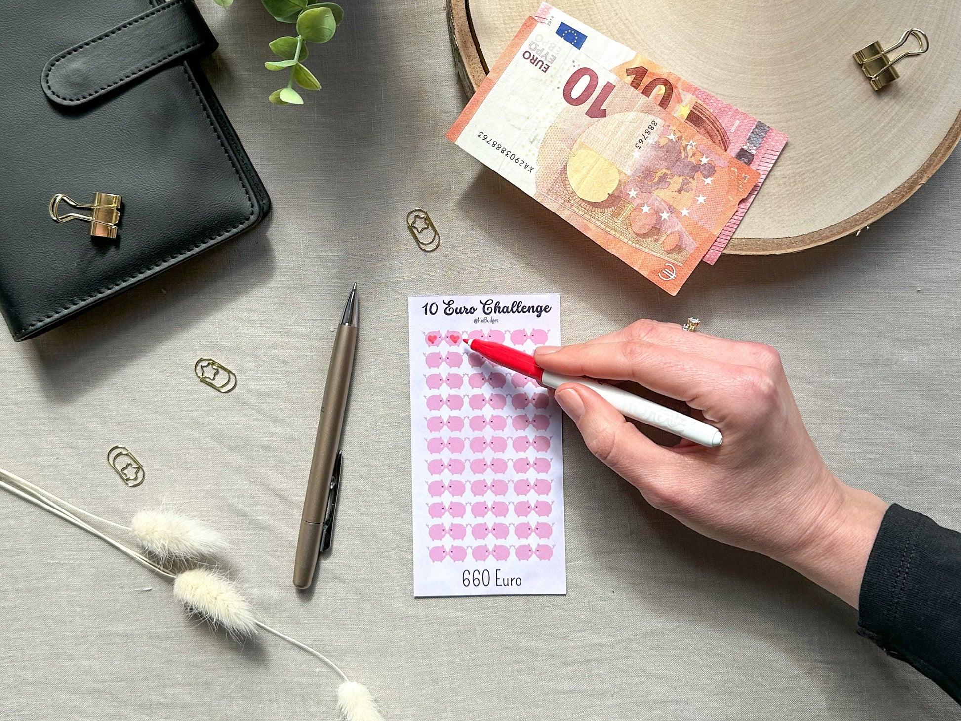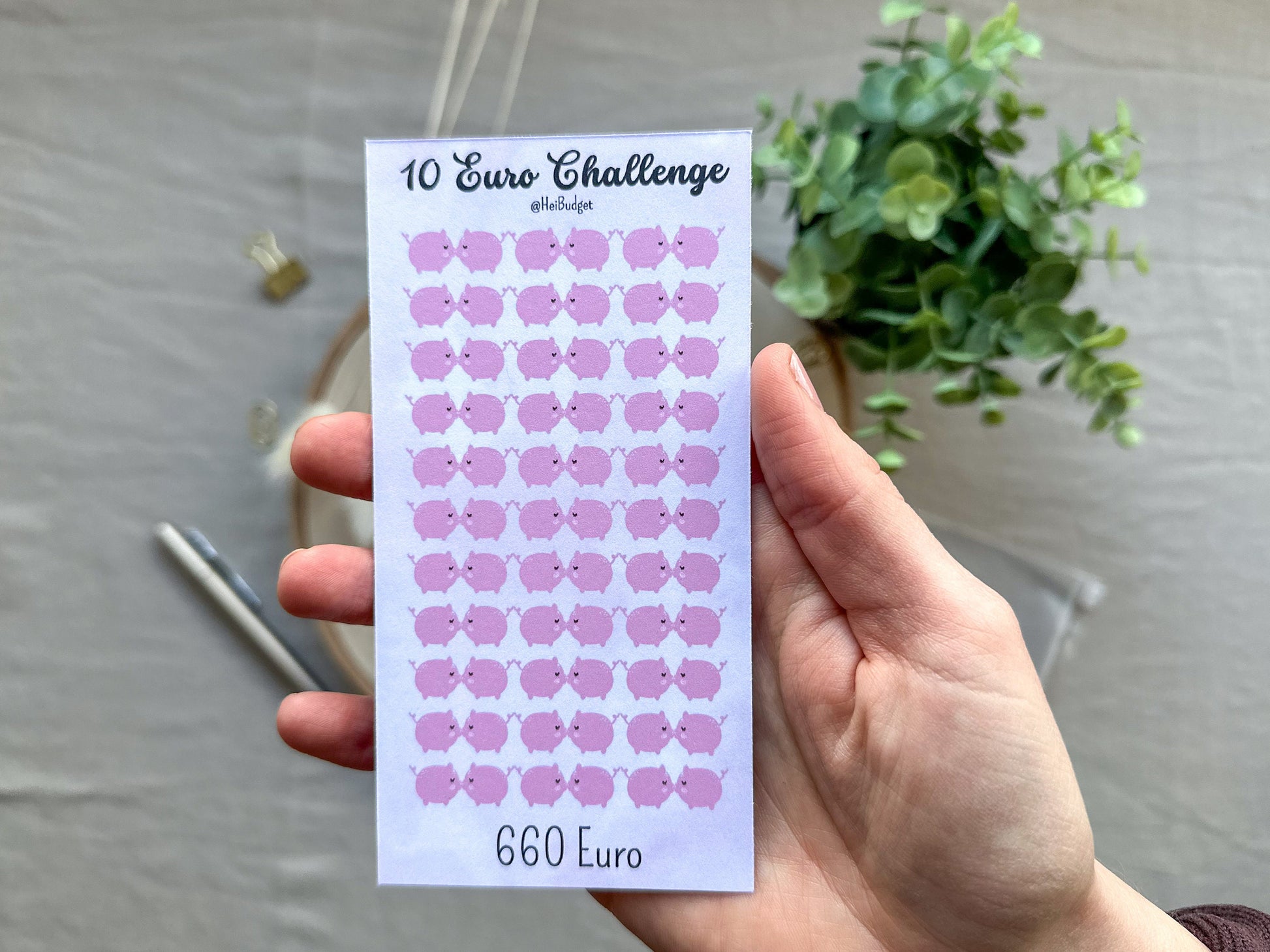 Die 10 Euro Challenge ist ein Klassiker unter den Sparchallenges! Hier bekommst du sie in einem süßen Schweinchen Look. Da macht das Sparen grunzig viel Spaß. Hast du am Ende alle Schweinchen abgestrichen, hast du 660 Euro gespart. Juhu!